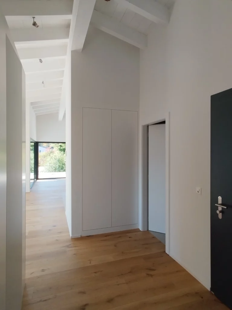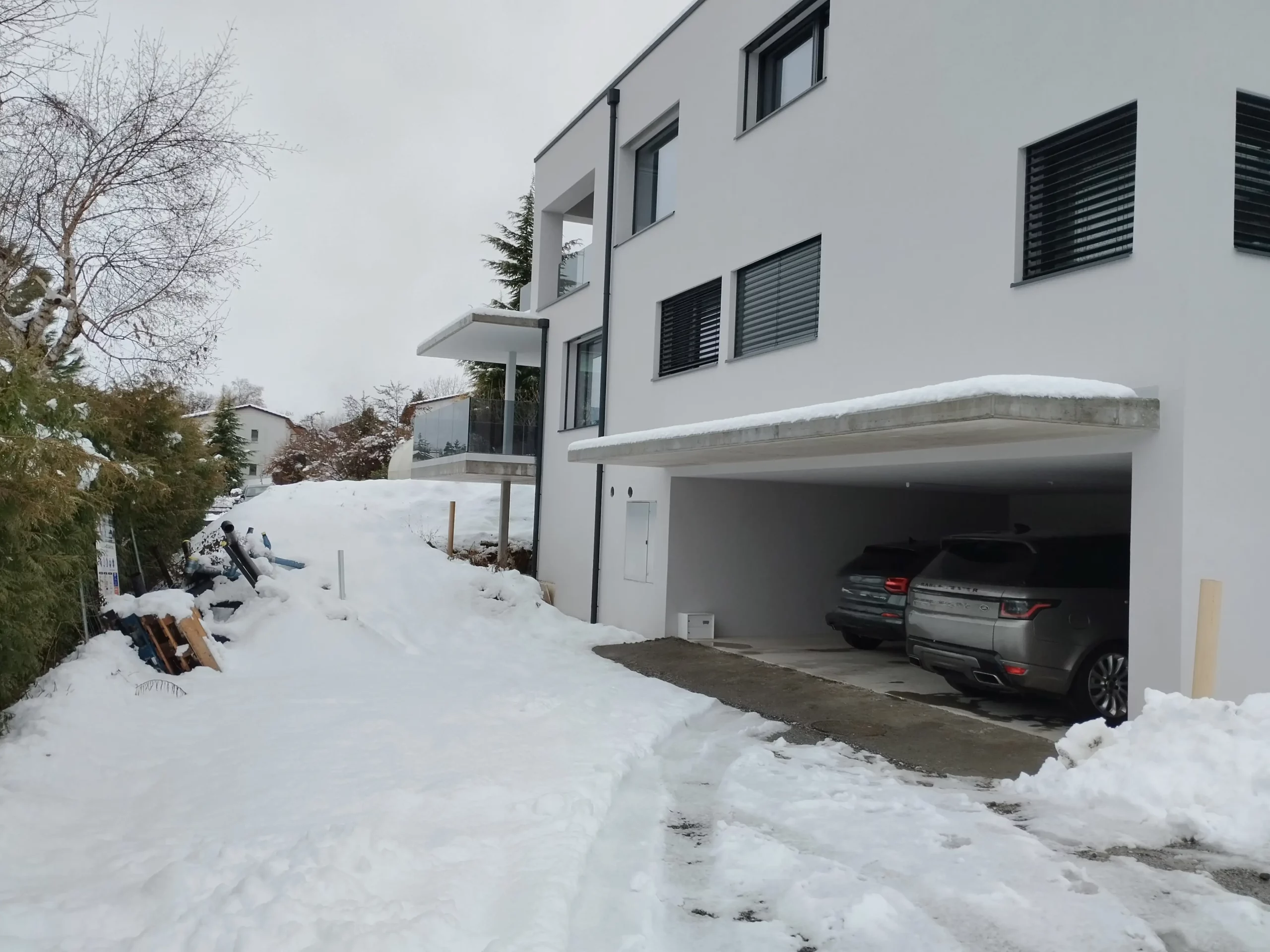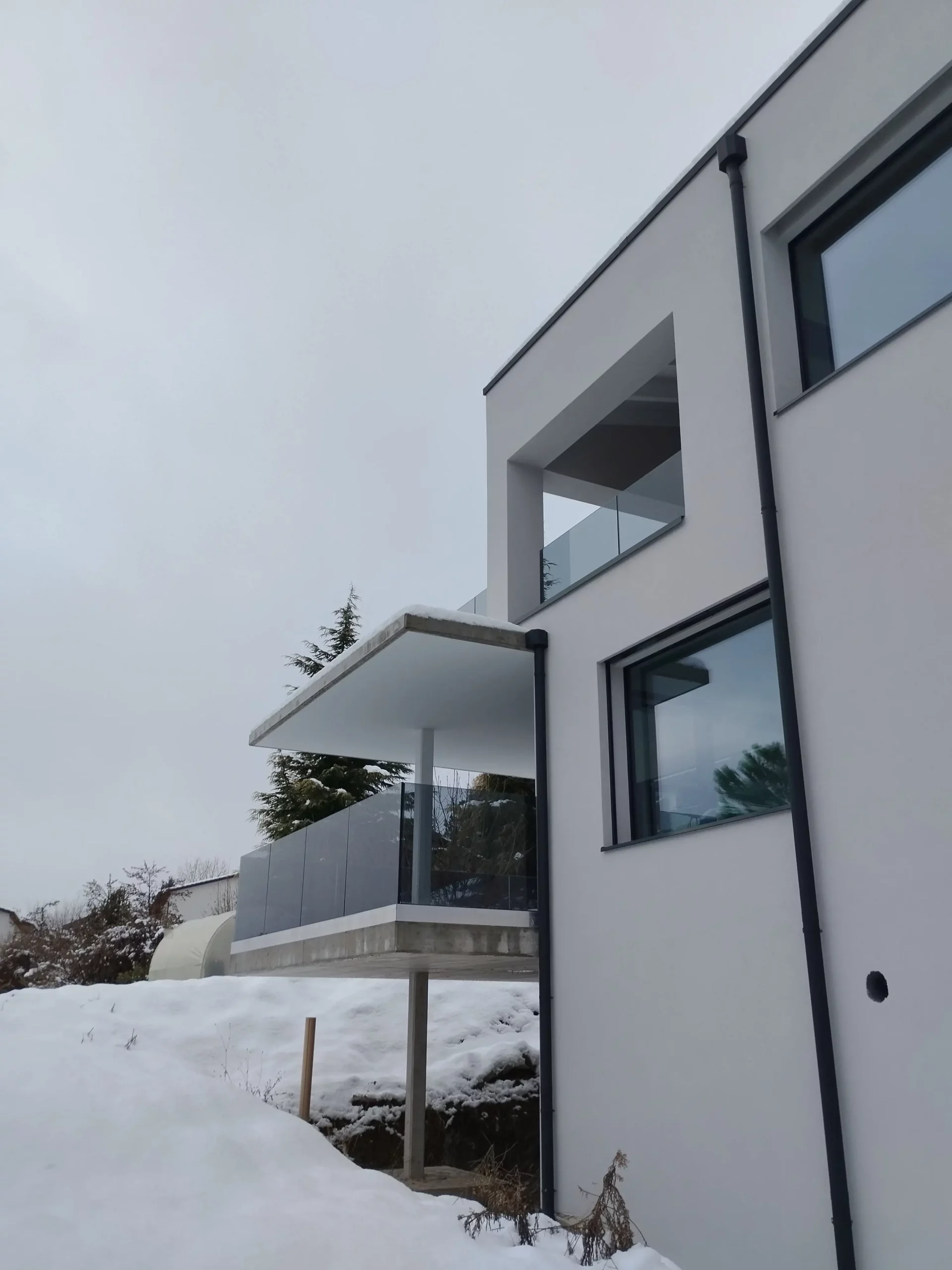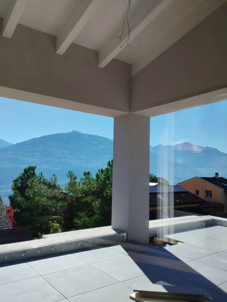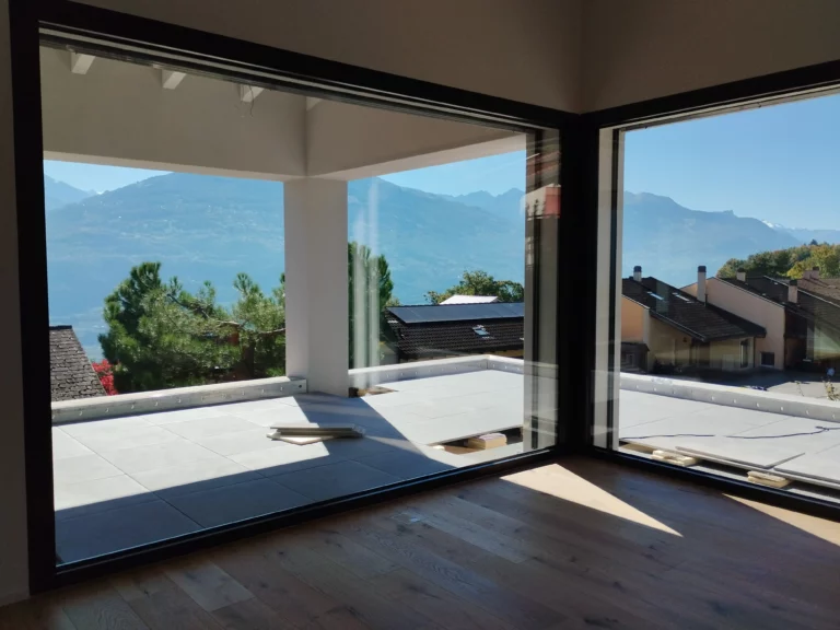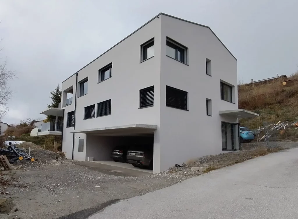 Ces deux villas de style moderne, avec un toit à 2 pans sans avant-toit, sont en construction au centre de Grimisuat. Elles sont composées d’un sous-sol avec couvert à voitures et de deux niveaux composés chacun d’un appartement d’environ 150 m2 avec de grandes terrasses partiellement couvertes. La toiture est équipée d’une installation photovoltaïque sur le pan de toit Sud. Les bâtiments sont chauffés avec une Pompe A Chaleur air-eau qui alimente le chauffage au sol. La PAC est réversible pour pouvoir rafraichir en été.